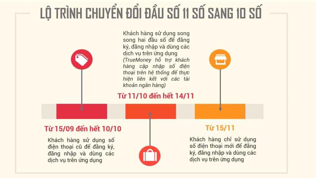 Theo đúng tiến trình các nhà mạng áp dụng, TrueMoney xin gửi tới khách hàng 3 giai đoạn chuyển đổi đầu số như sau: