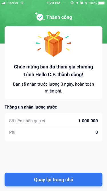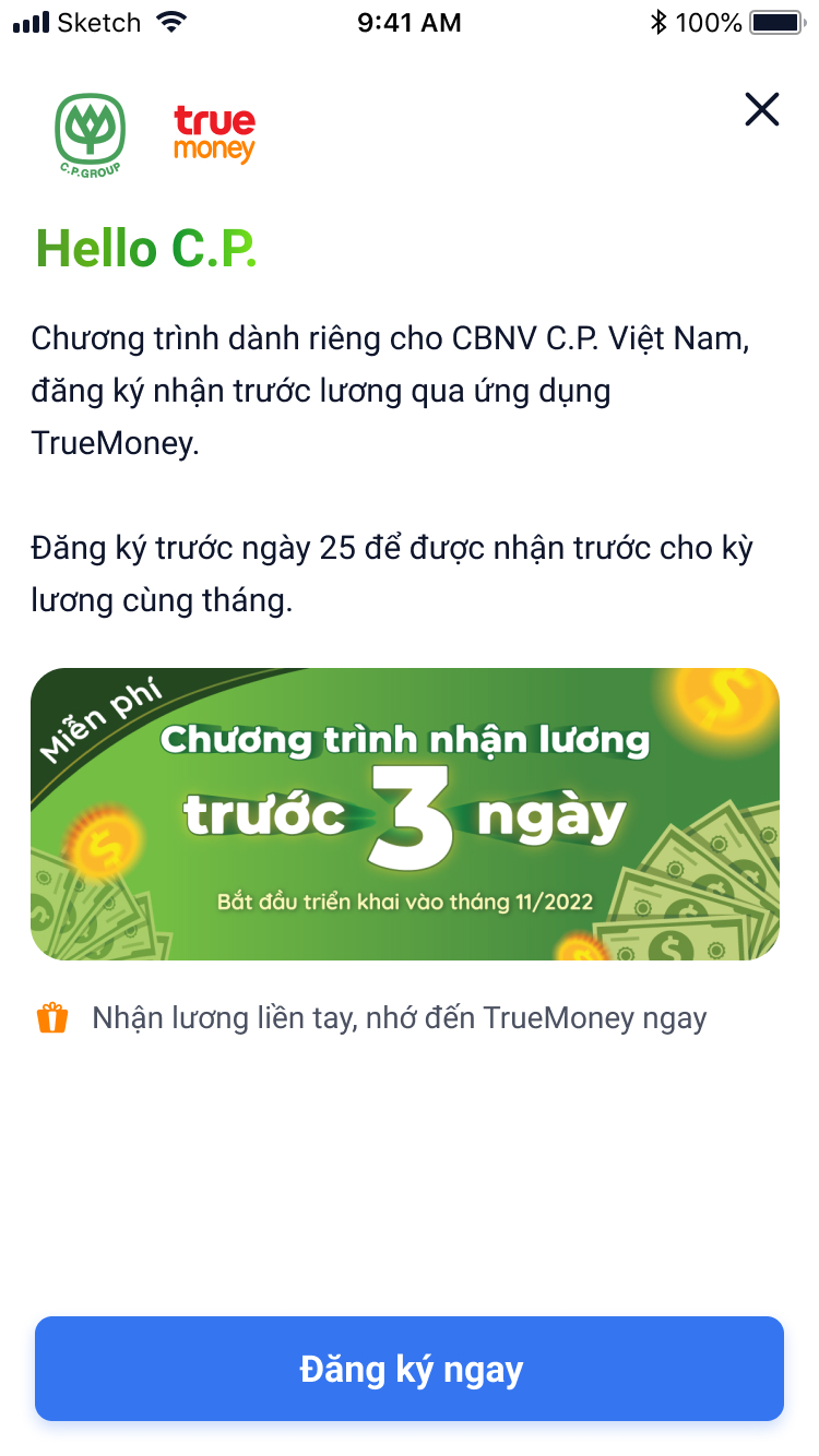 Áp dụng cho cán bộ nhân viên C.P đăng ký nhận lương sớm qua ví TrueMoney. Khách hàng sẽ nhận được lương sớm trước 03 ngày của kỳ cố định hàng tháng của công ty C.P (100% số tiền đã đăng ký nhận một phần qua ví TrueMoney)