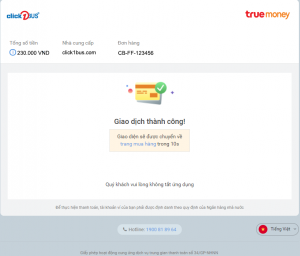 Đặc biệt từ 24/9 đến 24/10/2018, khi mua vé xe khách Click1BUS và thanh toán qua ví TrueMoney trên một trong 5 website mà Click1BUS quản lý và bán vé (xem Điều kiện & Điều khoản) với giá trị thanh toán từ 150,000đ trở lên, bạn sẽ được hoàn ngay 70,000đ vào tài khoản ví TrueMoney.