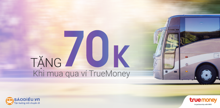 Từ nay đến 24/10/2018, khi mua vé xe khách trên website chính thức của Sáo Diều tại địa chỉ saodieu.vn với giá trị tối thiểu 180,000đ và thanh toán qua ví TrueMoney, bạn sẽ được hoàn tiền tối đa 70,000đ vào tài khoản ví.
