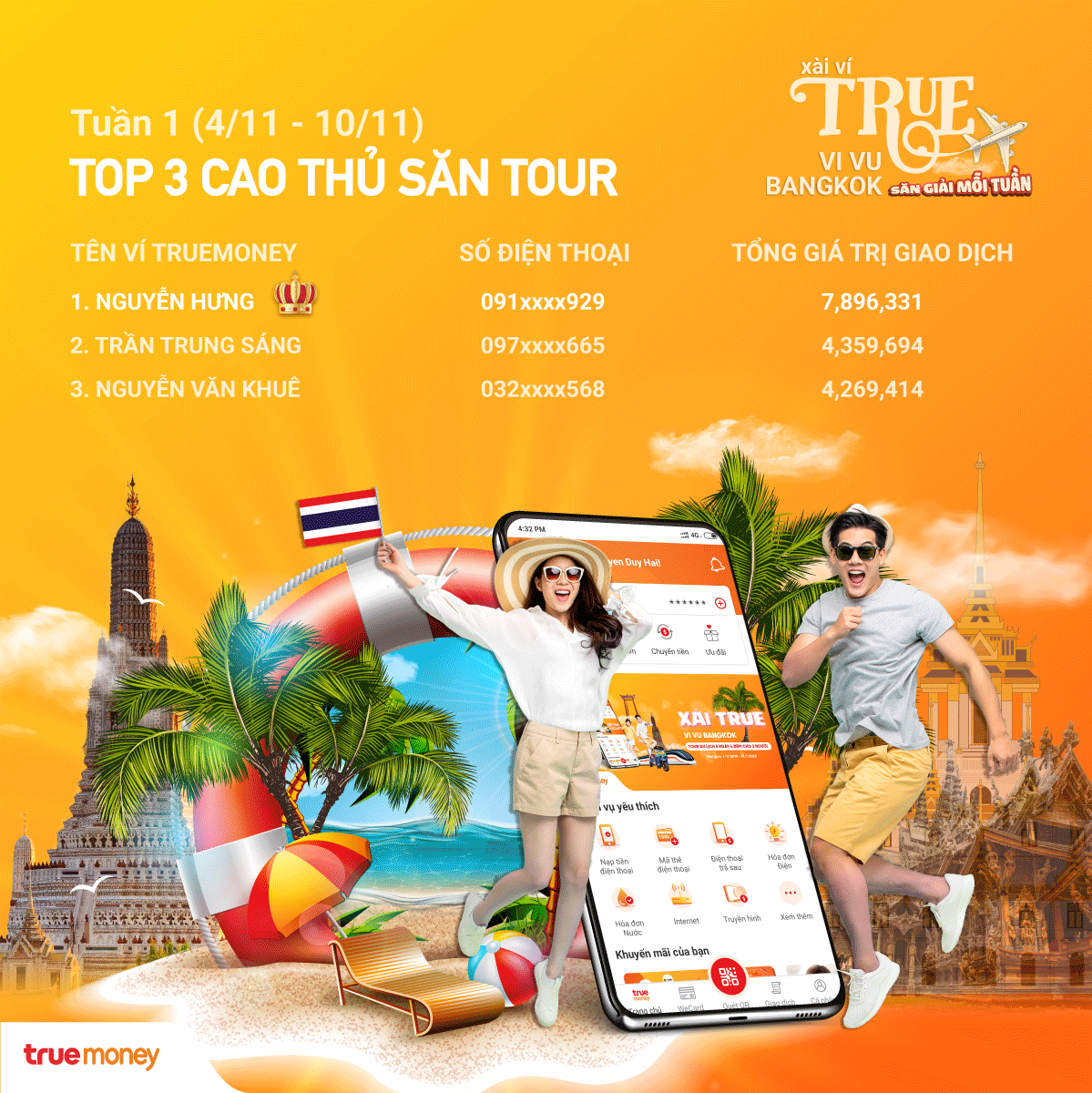 - 01 người dùng (app TrueMoney) có tổng giá trị giao dịch tích lũy cao nhất mỗi tuần (tính từ ngày thứ Hai tới ngày Chủ Nhật), được tặng thưởng 1 tour du lịch 5 ngày 4 đêm Bangkok – Pattaya cho 2 người, trị giá lên đến 8.000.000đ/ người
