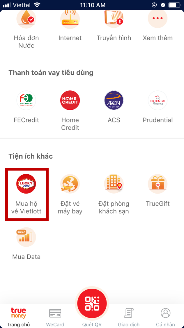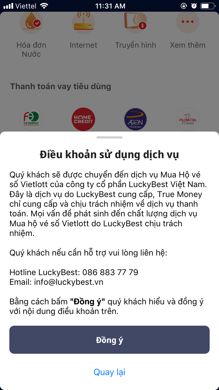 - Chọn tính năng “Mua hộ vé Vietlott” trên ví TrueMoney
