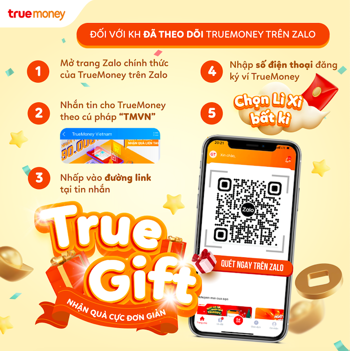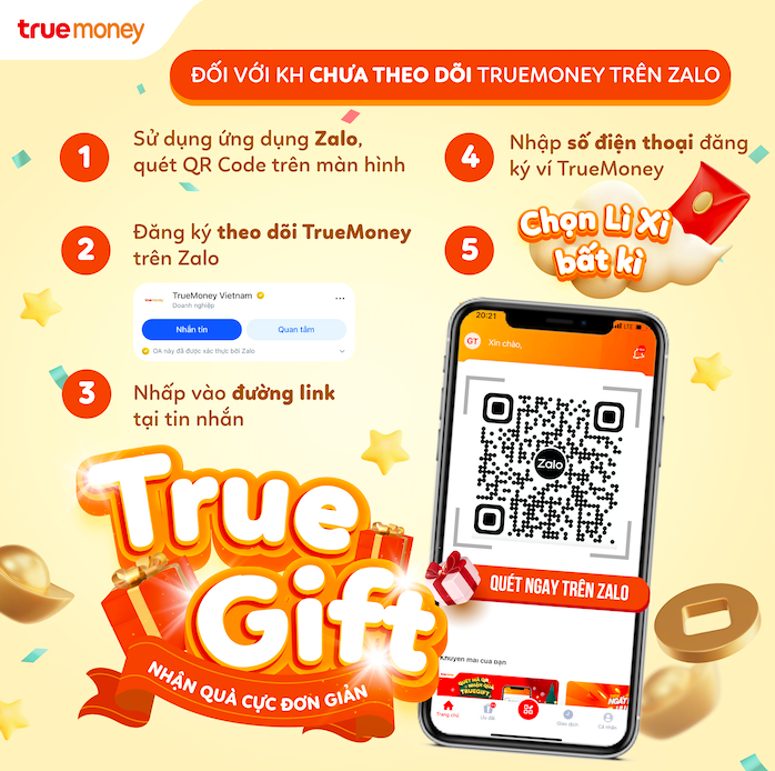 - Khách hàng quét QR code trên Zalo nhận 01 phần quà TrueGift từ ví TrueMoney.