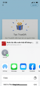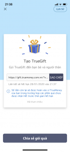 Bước 6: Link nhận lì xì TrueGift đã được tạo. Bạn có thể copy link này để gửi lì xì tới bạn bè, hoặc click vào Chia sẻ gói quà để tặng lì xì thông qua ứng dụng di động