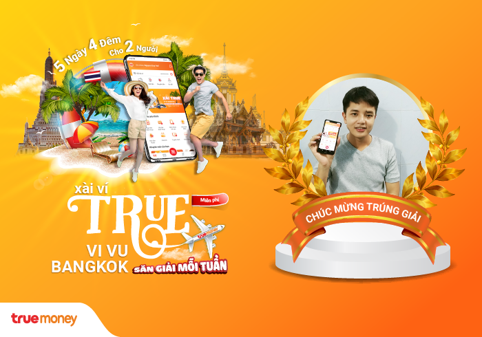 - 01 người dùng (app TrueMoney) có tổng giá trị giao dịch tích lũy cao nhất mỗi tuần (tính từ ngày thứ Hai tới ngày Chủ Nhật), được tặng thưởng 1 tour du lịch 5 ngày 4 đêm Bangkok – Pattaya cho 2 người, trị giá lên đến 8.000.000đ/ người